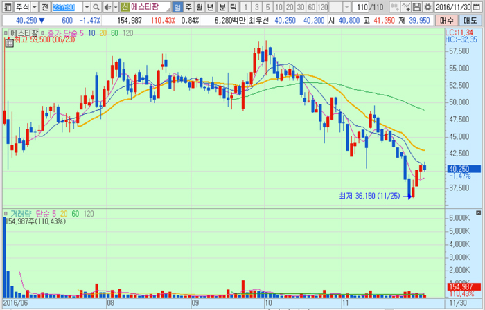 에스티팜의 주가는 11월 30일 종가 4만250원으로 올해 6월 23일의 5만9500원에 비해 32.4% 하락한 수준에서 거래되고 있다.
