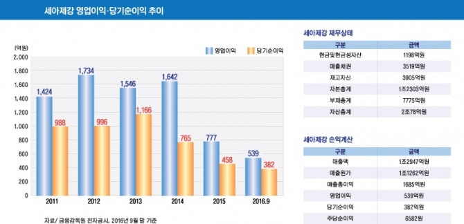 세아제강의 영업이익을 보면 2011년 1424억원, 2012년 1734억원, 2013년 1546억원, 2014년 1642억원, 2015년 777억원으로 지난해부터 급격하게 줄어드는 모습을 보이고 있다.