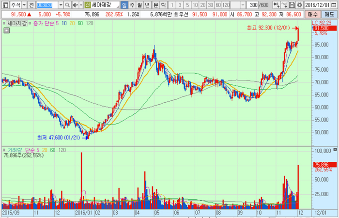 세아제강의 주가는 1일 종가 9만1500원으로 올해 1월 21일의 저점 4만7600원에 비해 92.2% 상승한 수준에서 거래되고 있다.