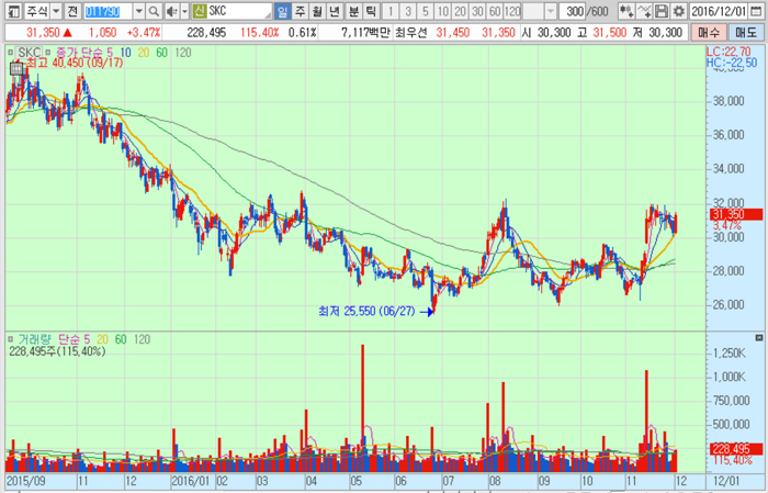 SKC의 주가는 1일 종가 3만1350원으로 지난해 9월 17일의 고점 4만450원에 비해 22.5% 하락한 수준에서 거래되고 있다.