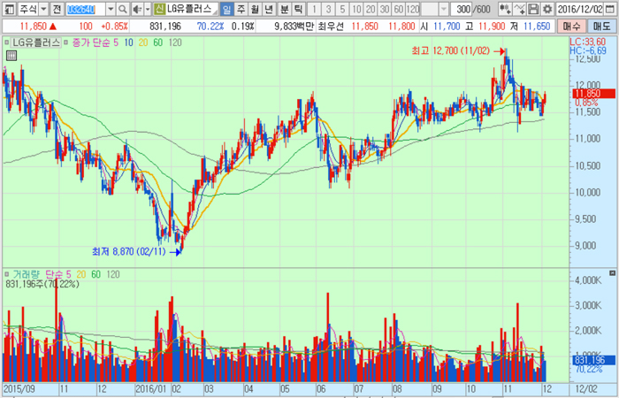 LG유플러스의 주가는 2일 종가 1만1850원으로 올해 2월 11일의 저점 8870원에 비해 33.6% 상승한 수준에서 거래되고 있다.