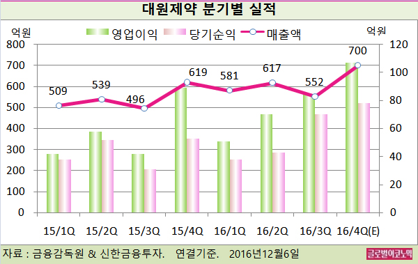 신한금융투자 이지용 연구원은 대원제약의 올해 4분기 연결기준 매출액이 700억원(전년동기비 +13.3%), 영업이익 107억원(전년동기비 +20.7%), 당기순이익 78억원(전년동기비 +47.2%)을 기록할 것으로 전망하고 있다.