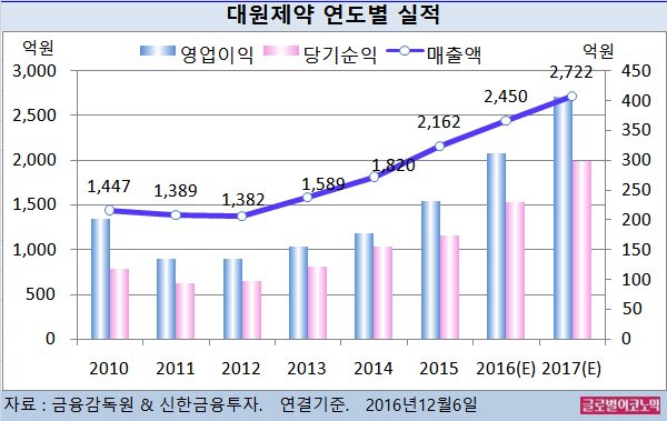 이 연구원은 대원제약의 올해 연결기준 매출액이 2450억원(전년비 +13.3%), 영업이익 311억원(전년비 +34.6%), 당기순이익 229억원(전년비 +32.4%)을 기록할 것으로 내다보고 있다.