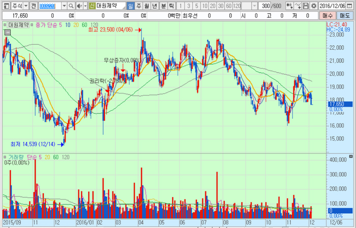 대원제약의 주가는 5일 종가 1만7650원으로 올해 4월 6일의 고점 2만3500원에 비해 24.9% 하락한 수준에서 거래되고 있다.