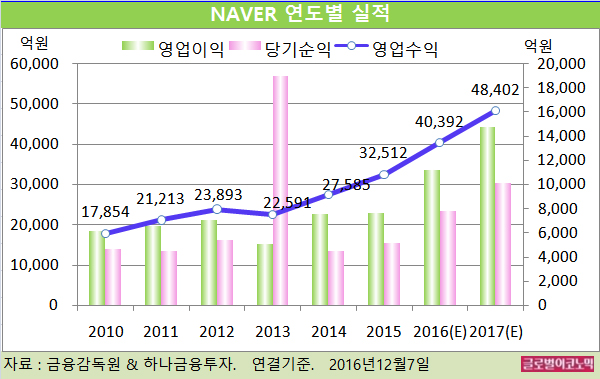 황 연구원은 네이버의 2017년 연결기준 영업수익이 4조8402억원(전년비 +19.8%), 영업이익 1조4788억원(전년비 +32.3%), 당기순이익 1조160억원(전년비 +29.8%)에 이를 것으로 전망하고 있다.
