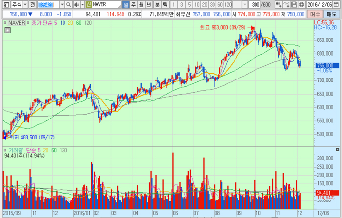 NAVER의 주가는 6일 종가 75만6000원으로 올해 9월 29일의 고점 90만3000원에 비해 16.3% 하락한 수준에서 거래되고 있다.