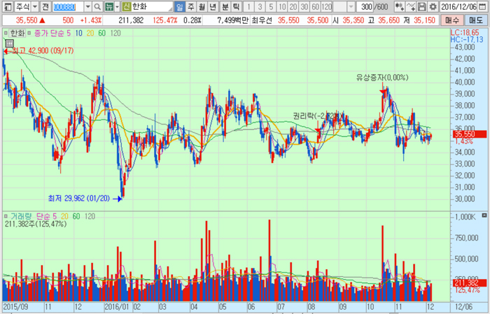 한화의 주가는 6일 종가 3만5550원으로 올해 1월 20일의 저점 2만9962원보다 18.7% 상승한 수준에서 거래되고 있다.