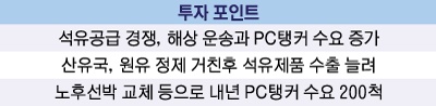 박 연구원은 “PC탱커는 세계 석유 공급경쟁, 석유제품의 지역별 불균형, 환경규제로 인한 노후선박 대체수요 등의 이유로 내년 발주량이 200척 이상을 기록할 것”이라며 “PC탱커 분야 선두 조선업체인 현대미포조선의 가장 큰 수혜가 기대된다”고 진단했다.