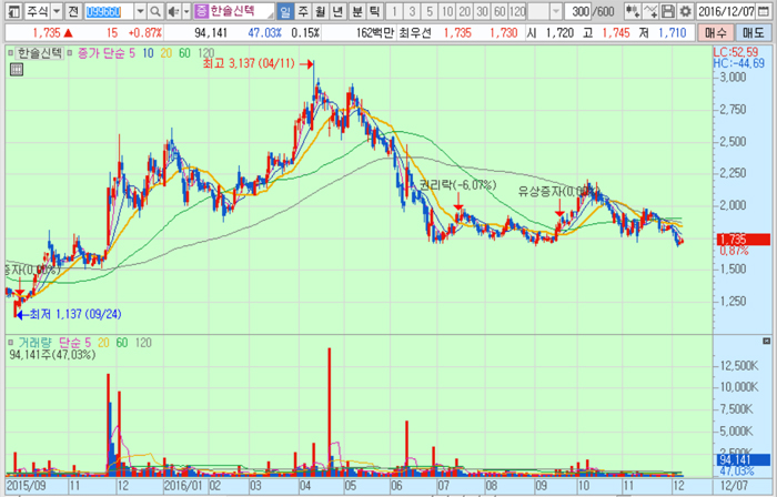 한솔신텍의 주가는 7일 종가 1735원으로 올해 4월 11일의 고점 3137원에 비해 44.7% 하락한 수준에서 거래되고 있다.