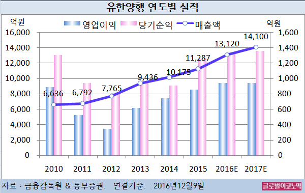 구 연구원은 유한양행의 2017년 매출액이 1조4100억원(전년비 +7.5%), 영업이익 940억원(전년비 0.0%), 당기순이익 1360억원(전년비 +1.5%)에 이를 것으로 전망하고 있다.