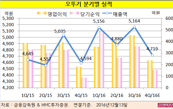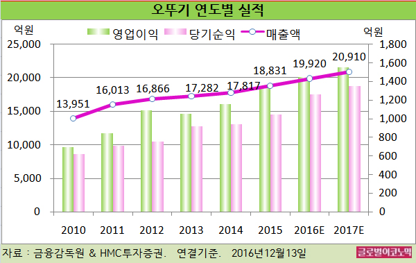 이어 2017년에는 연결기준 매출액 2조910억원(전년비 +5.0%), 영업이익 1550억원(전년비 +6.9%), 당기순이익 1350억원(전년비 +7.1%)에 이를 전망이다.
