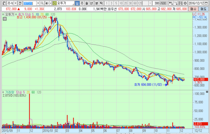 오뚜기의 주가는 12일 종가 67만2000원으로 올해 1월 25일의 143만4000원에 비해 53.1% 하락한 수준에서 거래되고 있다.