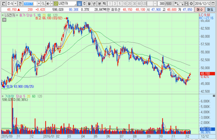 LG전자의 주가는 12일 종가 4만8150원으로 올해 3월 2일의 고점 6만6100원에 비해 27.2% 하락한 수준에서 거래되고 있다.