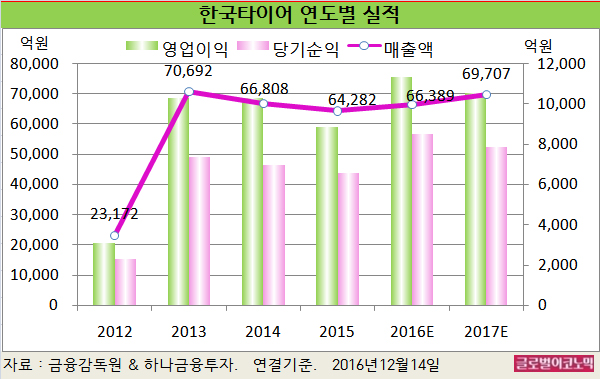 송 연구원은 한국타이어의 올해 연결기준 매출액이 6조6389억원(전년비 +3.3%), 영업이익 1조1335억원(전년비 +28.5%), 당기순이익 8531억원(전년비 +29.9%)을 기록할 것으로 내다보고 있다.