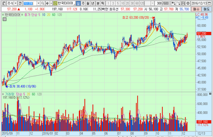 한국타이어의 주가는 13일 종가 5만7200원으로 지난해 10월 6일의 저점 3만8400원에 비해 49.0% 상승한 수준에서 거래되고 있다.
