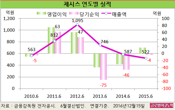 6월 결산법인인 체시스는 2012년 6월을 기점으로 점차 위축되는 모습을 보이고 있다.