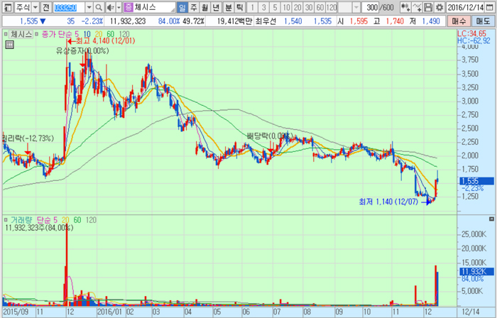 이미지 확대보기체시스는 이 회사의 이명곤 회장이 김무성 전 대표와 고등학교와 대학교 동문이라는 이유로 김무성 테마주로 오르고 있다.