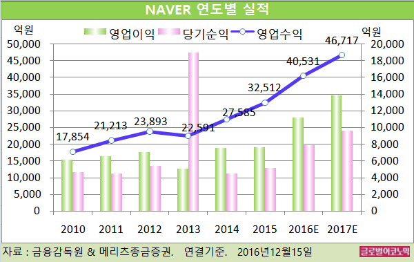 김 연구원은 네이버의 올해 연결기준 영업수익이 4조531억원(전년비 +24.7%), 영업이익 1조1199억원(전년비 +46.9%), 당기순이익 7856억원(전년비 +52.0%)을 기록할 것으로 내다보고 있다.