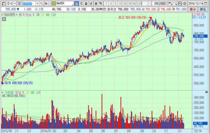 네이버의 주가는 14일 종가 78만5000원으로 지난해 9월 25일의 저점 49만9500원에 비해 57.2% 상승한 수준에서 거래되고 있다.