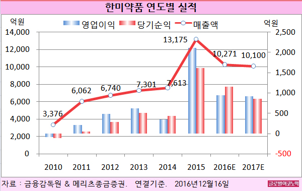 HMC투자증권 강양구 연구원은 한미약품의 올해 연결기준 매출액이 1조271억원(전년비 -22.0%), 영업이익 942억원(전년비 -55.5%), 당기순이익 1152억원(전년비 -28.9%)을 기록할 것으로 내다보고 있다.
