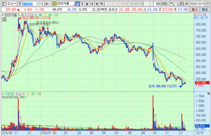 한미약품의 주가는 15일 종가 32만500원으로 지난해 11월 10일의 고점 86만951원에 비해 62.9% 하락한 수준에서 거래되고 있다.