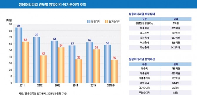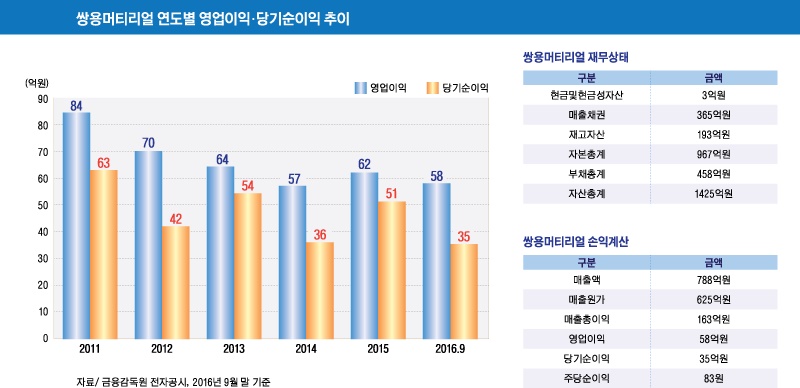쌍용머티리얼은 지난해 연결기준 매출액 1066억원, 영업이익 62억원, 당기순이익 51억원을 기록했다.