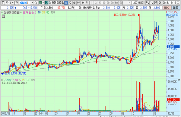 쌍용머티리얼의 주가는 15일 종가 3605원으로 올해 10월 25일의 고점 5380원에 비해 33.0% 하락한 수준에서 거래되고 있다.