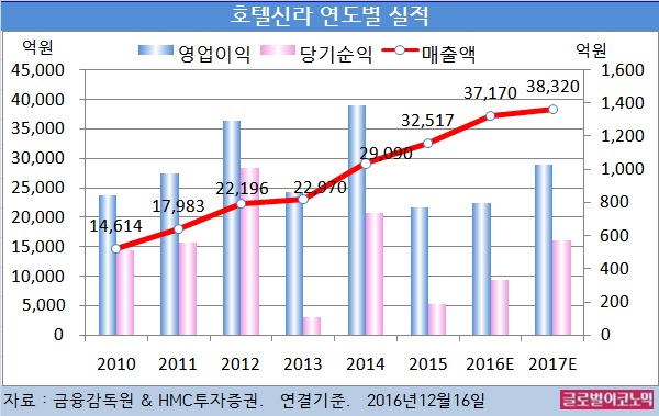 HMC투자증권 박종렬 연구원은 호텔신라의 올해 연결기준 매출액이 3조7170억원(전년비 +14.3%), 영업이익 800억원(전년비 +3.6%), 당기순이익 330억원(전년비 +78.4%)을 기록할 것으로 내다보고 있다.