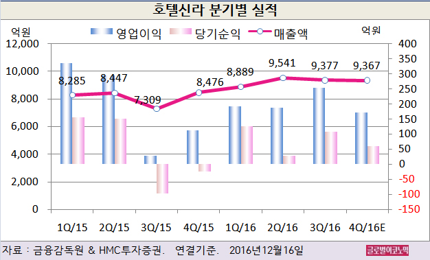 박 연구원은 호텔신라의 4분기 연결기준 매출액이 9367억원(전년동기비 +10.5%), 영업이익 171억원(전년동기비 +51.5%), 당기순이익 60억원(흑자전환)을 보일 것으로 예상하고 있다.