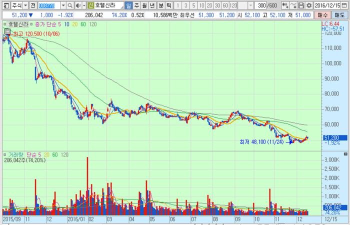 호텔신라의 주가는 15일 종가 5만1200원으로 지난해 10월 6일의 고점 12만500원에 비해 57.5% 하락한 수준에서 거래되고 있다.