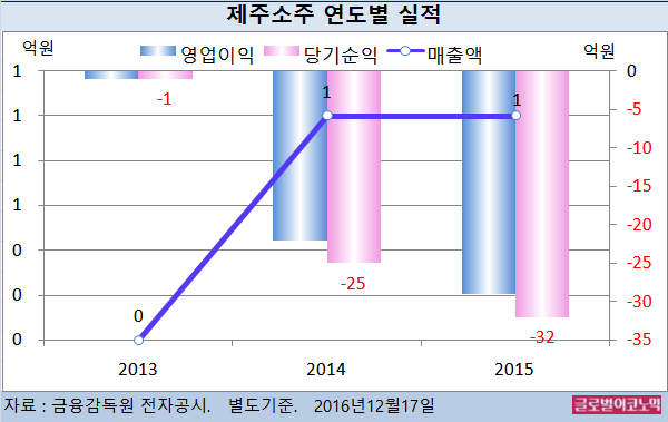 제주소주의 자본금은 2013년 25억원, 2014년 70억원, 2015년 100억원으로 꾸준히 늘려 왔다. 그러나 계속된 적자로 인해 자본총계는 계속 줄어들었다.