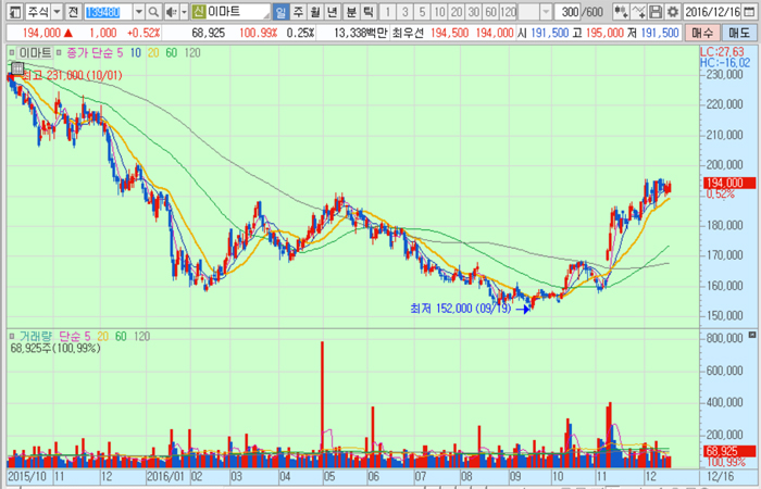 이마트의 주가는 16일 19만2500원으로 올해 9월 19일의 저점 15만2000원에 비해 27.6% 상승한 수준에서 거래되고 있다.