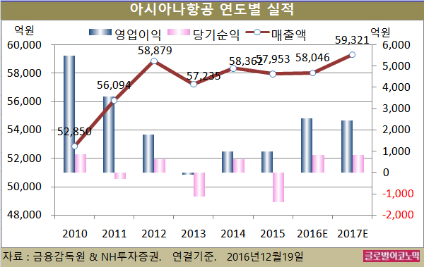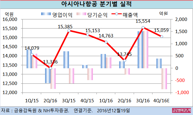 아시아나항공은 올해 3분기에 1516억원의 영업이익을 달성하는 호조를 기록했지만 최근 비수기 진입과 중국의 한류금지 정책 영향을 받고 있고 구조조정 성과도 미미한 상황이다.