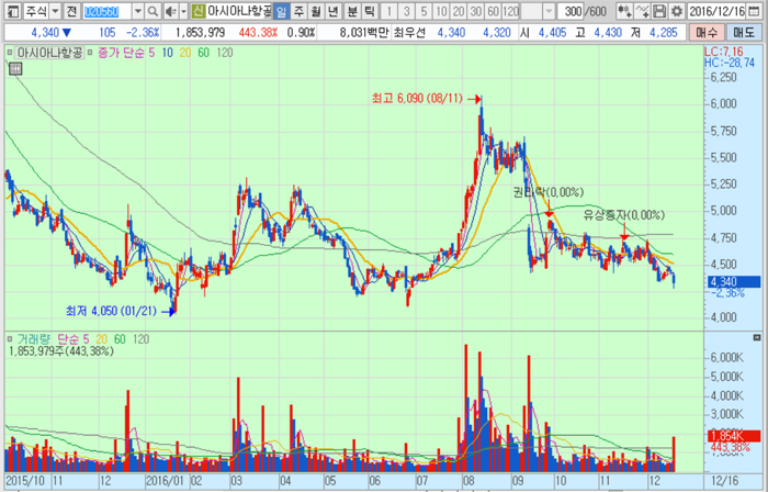 아시아나항공의 주가는 16일 종가 4340원으로 올해 8월 11일의 고점 6090원에 비해 28.7% 하락한 수준에서 거래되고 있다.