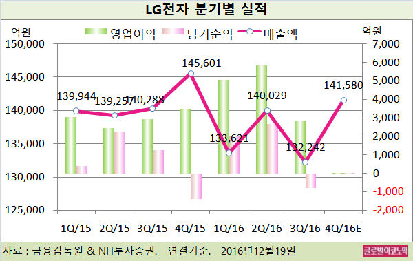 고 연구원은 LG전자의 올해 연결기준 매출액이 54조7470억원(전년비 -3.1%), 영업이익 1조3740억원(전년비 +15.2%), 당기순이익 4230억원(전년비 +69.8%)을 기록할 것으로 내다보고 있다.