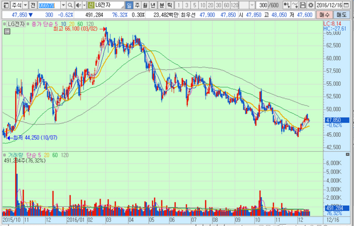 LG전자의 주가는 16일 16일 종가 4만7850원으로 올해 3월 2일의 고점 6만6100원에 비해 27.6% 하락한 수준에서 거래되고 있다.