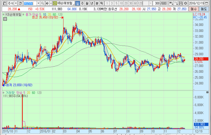 KB손해보험의 주가는 19일 종가 2만8200원으로 올해 3월 2일의 고점 3만5450원에 비해 20.5% 하락한 수준에서 거래되고 있다.