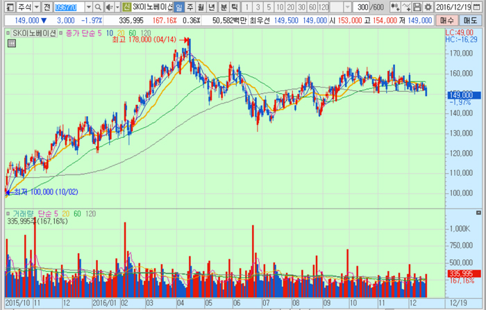 SK이노베이션의 주가는 19일 종가 14만9000원으로 지난해 10월 2일의 저점 10만원에 비해 49.0% 상승한 수준에서 거래되고 있다.