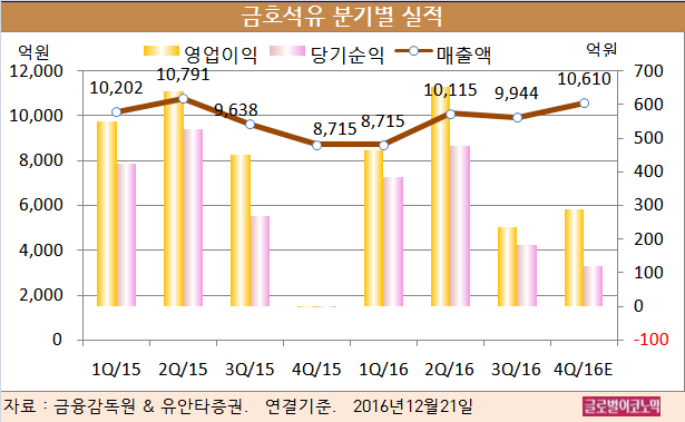 유안타증권 황규원 연구원은 금호석유화학의 올 4분기 연결기준 매출액이 1조610억원(전년동기비 +21.7%), 영업이익 287억원(흑자전환), 당기순이익 120억원을 기록할 것으로 내다보고 있다 지배주주 순이익은 순이익 121억원에 이를 전망이다.