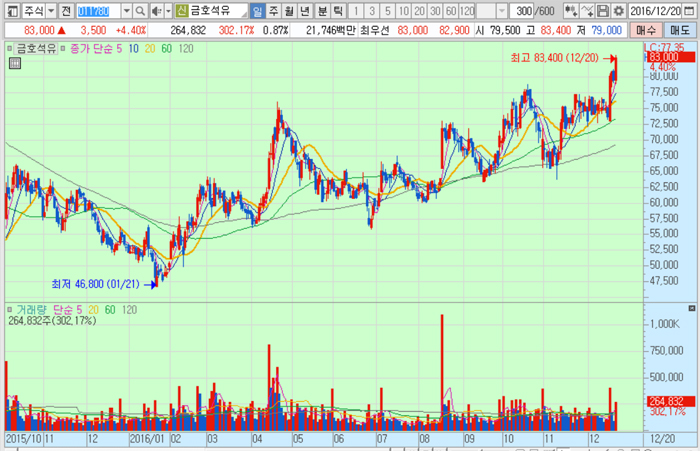 금호석유화학의 주가는 연초들어 꾸준한 오름세를 보이며 20일 종가 8만3000원으로 올해 1월 21일의 저점 4만6800원에 비해 77.4% 상승한 수준에서 거래되고 있다.
