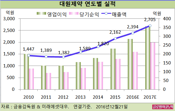 손 연구원은 대원제약이 2017년에도 제네릭과 개량신약(고지혈증 복합제 등) 10개 이상의 신제품이 출시될 예정으로 안정적인 매출 성장을 이어나갈 수 있을 것으로 판단하고 있다.