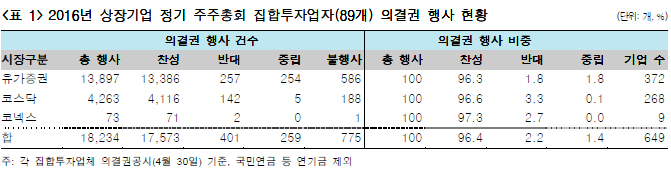이미지 확대보기한국기업지배구조원이 조사한 자료에 따르면 2016년 상장기업 정기 주주총회에서 89개 집합투자업자 의결권 행사는 반대 의결권 행사 비중이 전체의 2.2%에 불과했다.