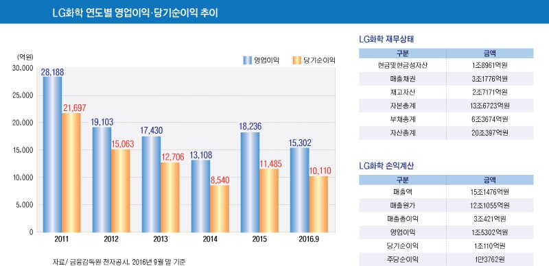 LG화학의 당기순이익은 2011년 2조1697억원, 2012년 1조5063억원, 2013년 1조2706억원, 2014년 8540억원, 2015년 1조1485억원으로 2014년을 제외하고는 매년 1조원을 넘어섰다.