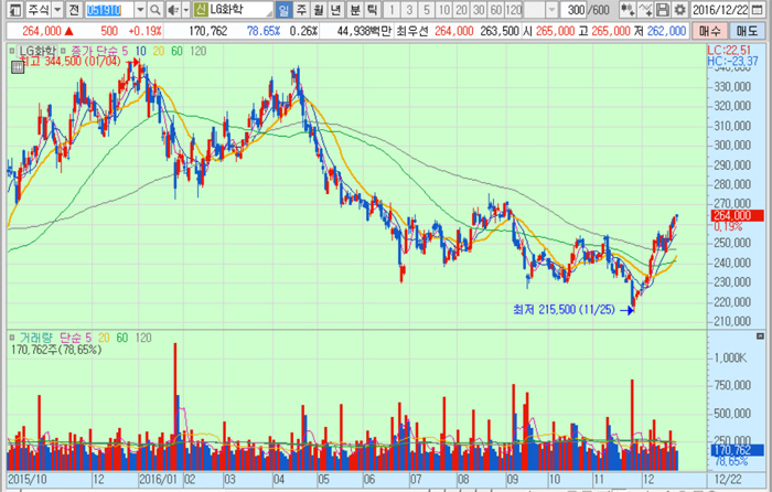 LG화학의 주가는 22일 종가 26만4000원으로 올해 11월 25일의 저점 21만5500원에 비해 22.5% 상승한 수준에서 거래되고 있다.