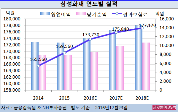 한 연구원은 올해 삼성화재의 별도기준 원수보험료가 17조3730억원(전년비 +2.5%), 영업이익 1조1600억원(전년비 +8.3%), 당기순이익 8540억원(전년비 +9.1%)을 기록할 것으로 내다보고 있다.