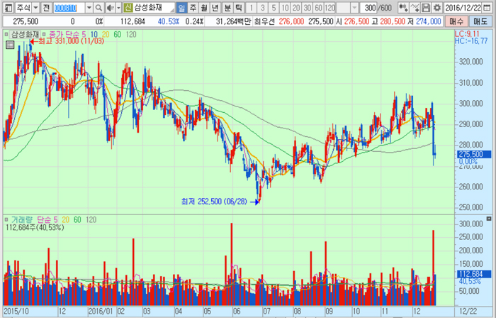 삼성화재의 주가는 22일 종가 27만5500원으로 올해 6월 28일의 저점 25만2500원에 비해 9.1% 오른 수준에서 거래되고 있다.