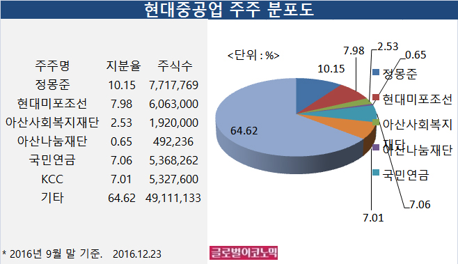 현대중공업의 주주분포는 최대주주인 정몽준 아산재단 이사장이 지분 10.15%(771만7769주)를 갖고 있다. 또 현대미포조선 7.98%(606만3000주), 아산사회복지재단 2.53%(192만주), 아산나눔재단이 0.65%(49만2236주)를 보유하고 있다.