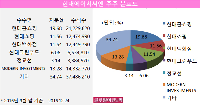 현대에이치씨엔 주주 분포는 지난 9월 말 현재 현대홈쇼핑을 포함한 특수관계인이 51.97%(5607만3785주)를 갖고 있었으나 이번 칼라일 지분 인수로 69.27%(7473만9320주)로 늘어나게 됐다.