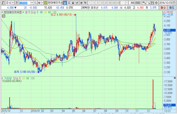 현대에이치씨엔의 주가는 23일 종가 4000원으로 올해 1월 6일의 저점 3100원에 비해 29.0% 오른 수준에서 거래되고 있다.