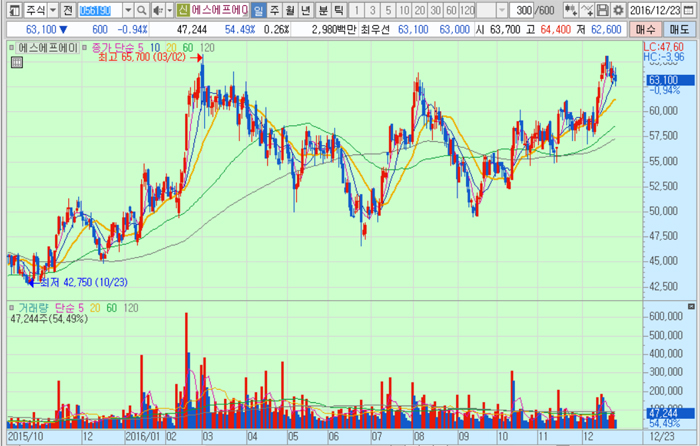 에스에프에이 주가는 23일 종가 6만3100원으로 지난해 10월 23일의 저점 4만2750원에 비해 47.6% 상승한 수준에서 거래되고 있다.